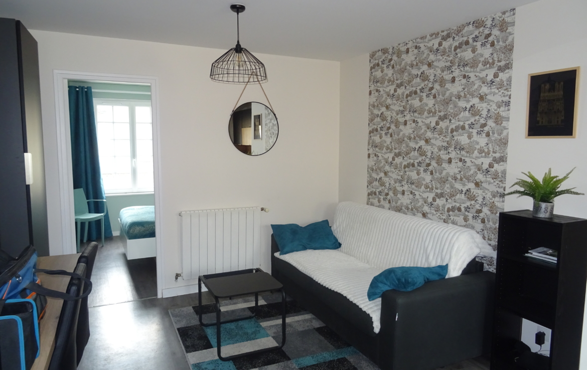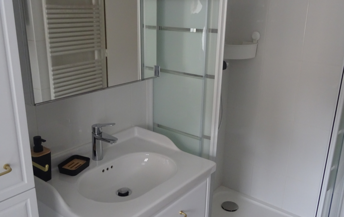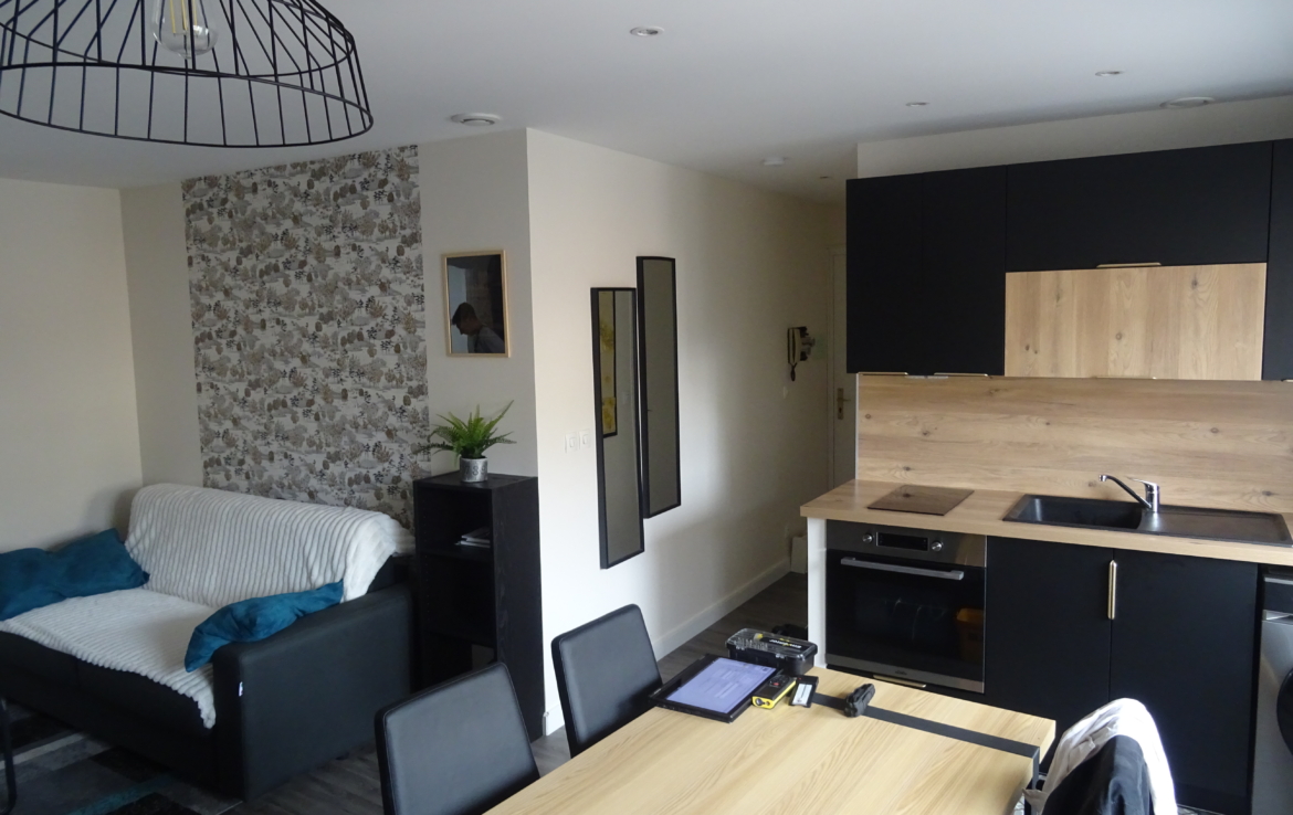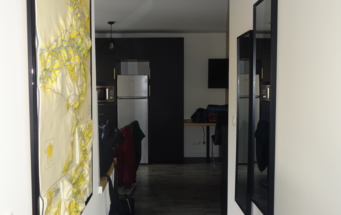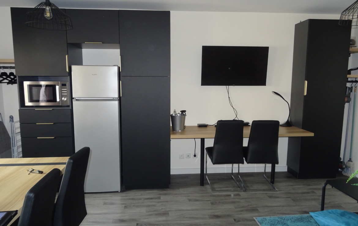 Appartement de type 2 meublé de 37.67m² situé au 3ème étage, comprenant une entrée, une pièce principale avec une cuisine ouverte meublée et équipée (plaque, hotte, four, micro-ondes, réfrigérateur), une chambre et une salle de douche avec wc.